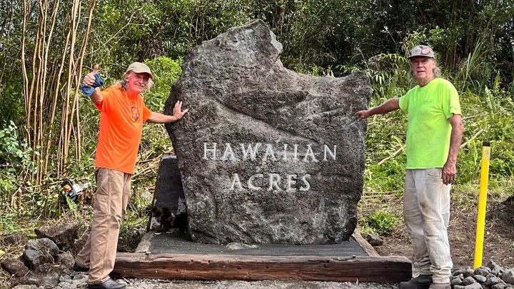 We are grateful for the work of our volunteers, road reps, and board members- all who dedicate hours of work towards improving our roads for our community for free. We wanted to highlight two “Hawaiian Acres Heroes” for their contributions this past year- Jack Russell Brauherr has been working for years to get the Hawaiian Acres Entrance Pōhaku restored at Kuauli Rd. Finally that persistence paid off! Mahalo to Mr. Brauherr for his hard work & dedication! If you want to mahalo & support his efforts, please consider a donation to the GoFundMe he set up to get a Pōhaku for the Ainaloa entrance.